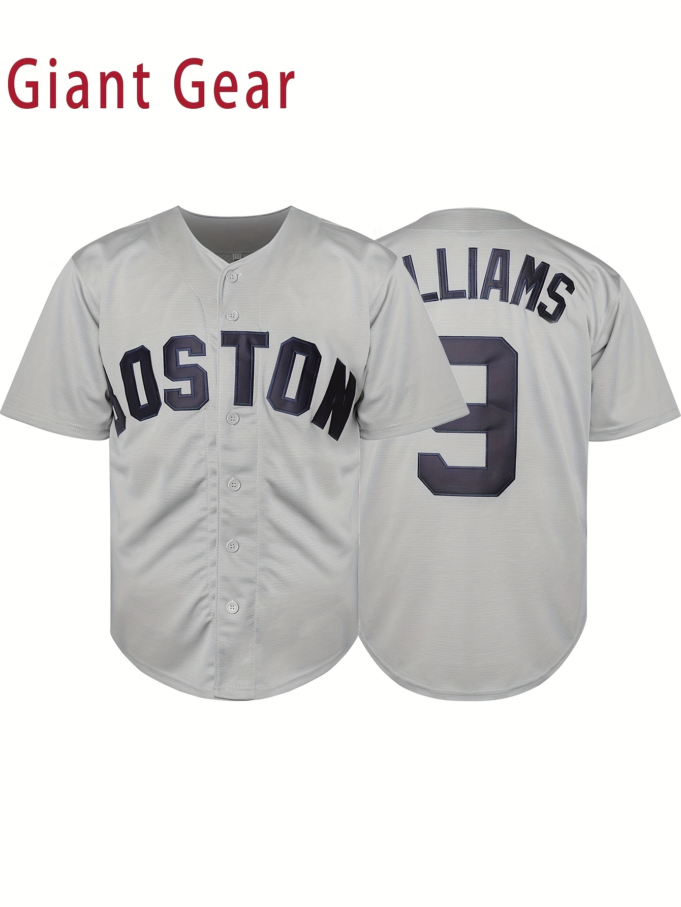 Men's Breathable Gray Baseball Jersey with Embroidered 'Boston' & Number 9V Collar - Loose Knit Polyester Sportswear for Team Sports, Beach, Casual Wear (Sizes S-3XL), Outdoor Activity Apparel, Embroidered Detailing
