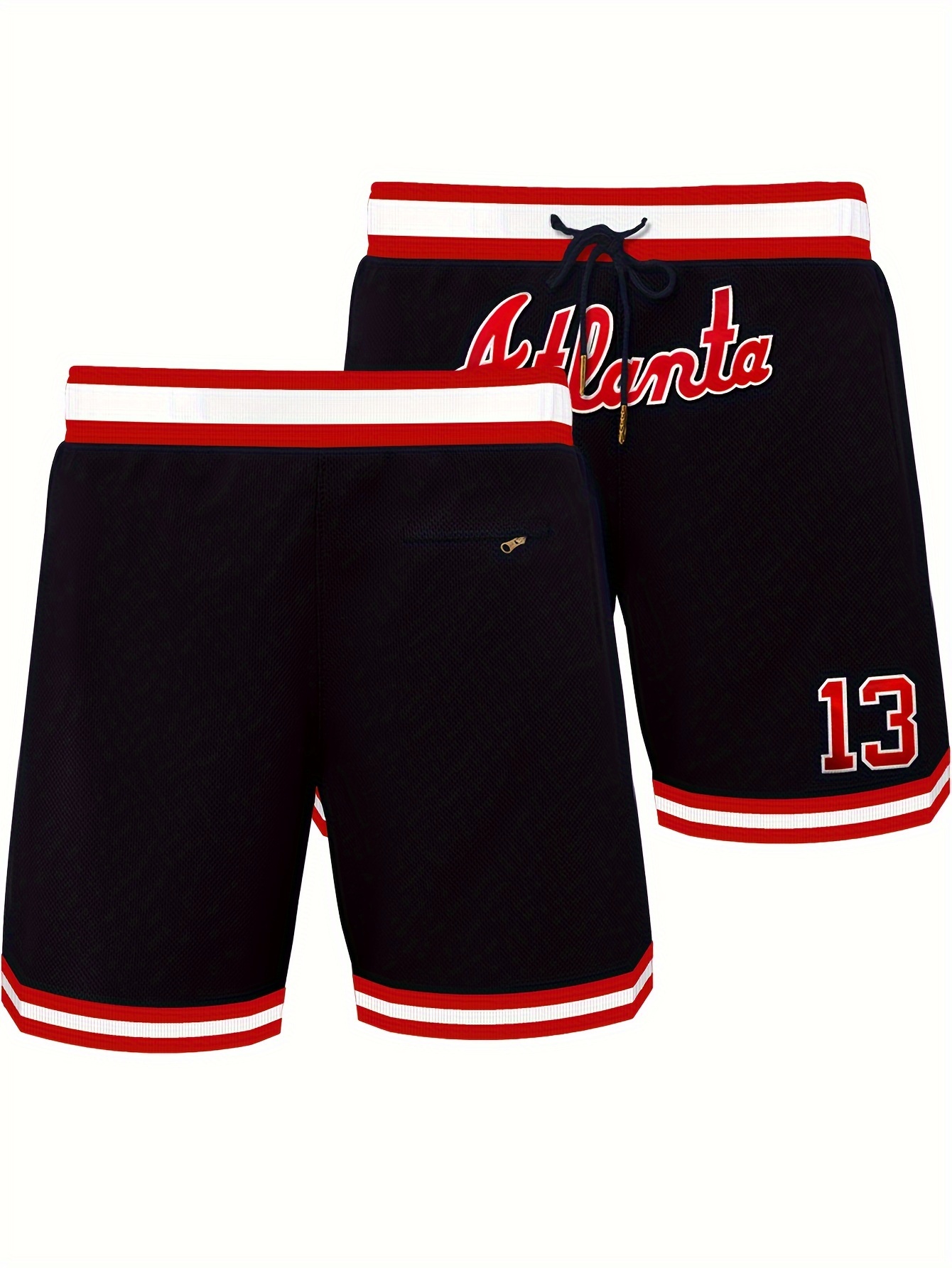 Men's #13 Atlanta Embroidered Basketball Shorts - Dark Blue, Breathable & Stylish with Pockets, Zipper Detail, Red & White Striped Trim, Ideal for Sports & Casual Wear, Athletic Leisure Wear|Relaxed Fit Shorts|Polyester Fabric, Basketball Gear